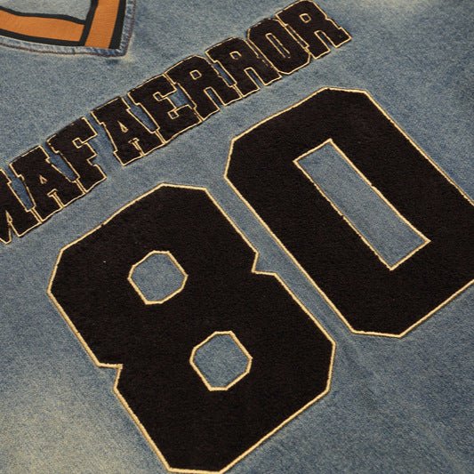 Design: Unique denim V-neck pullover with embroidered five-pointed star and lettering for a streetwear-inspired vibe