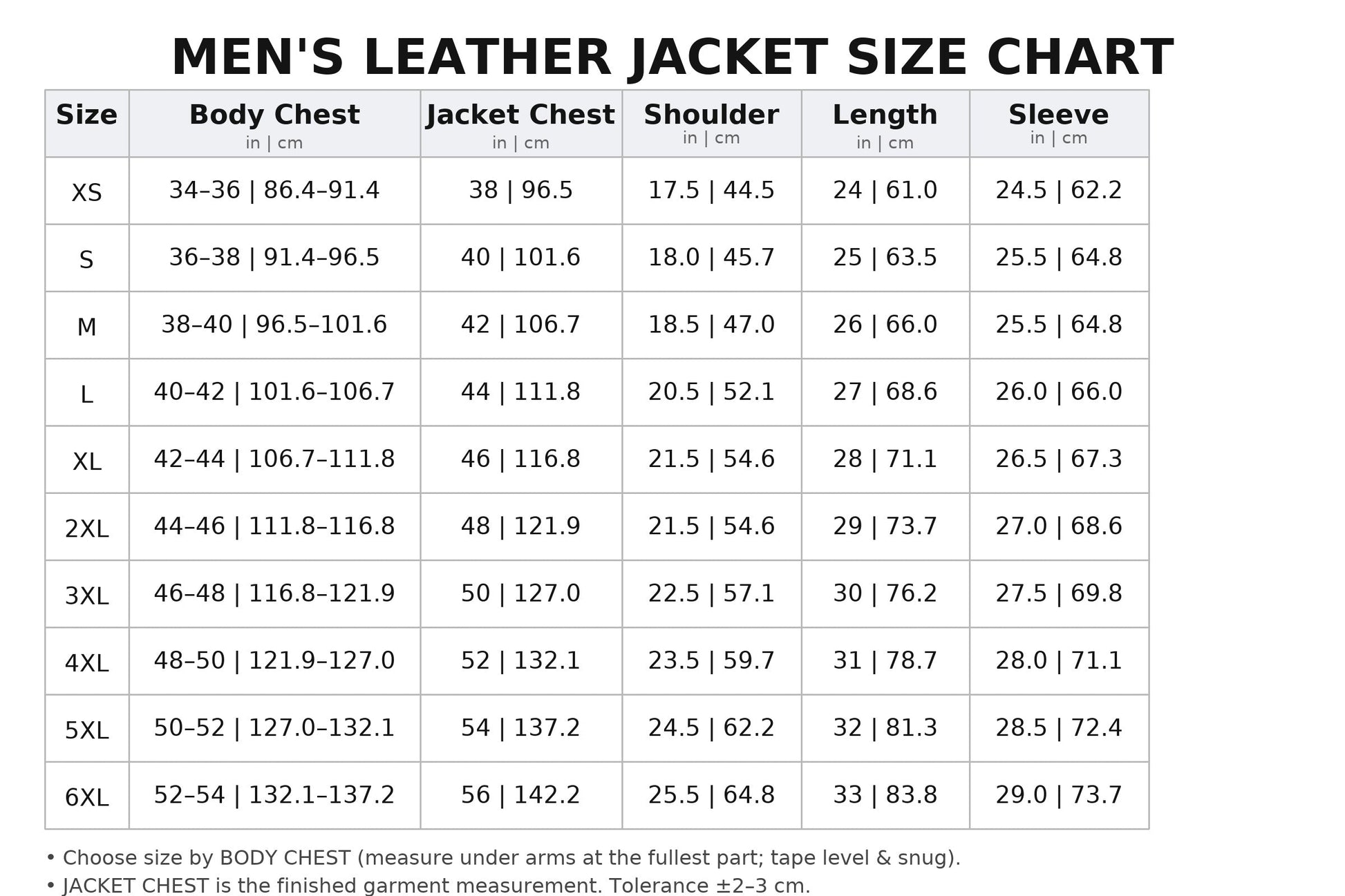 Choose size by Body Chest; Jacket Chest is the finished garment. If layering a hoodie, consider one size up. Tolerance ±2–3 cm.